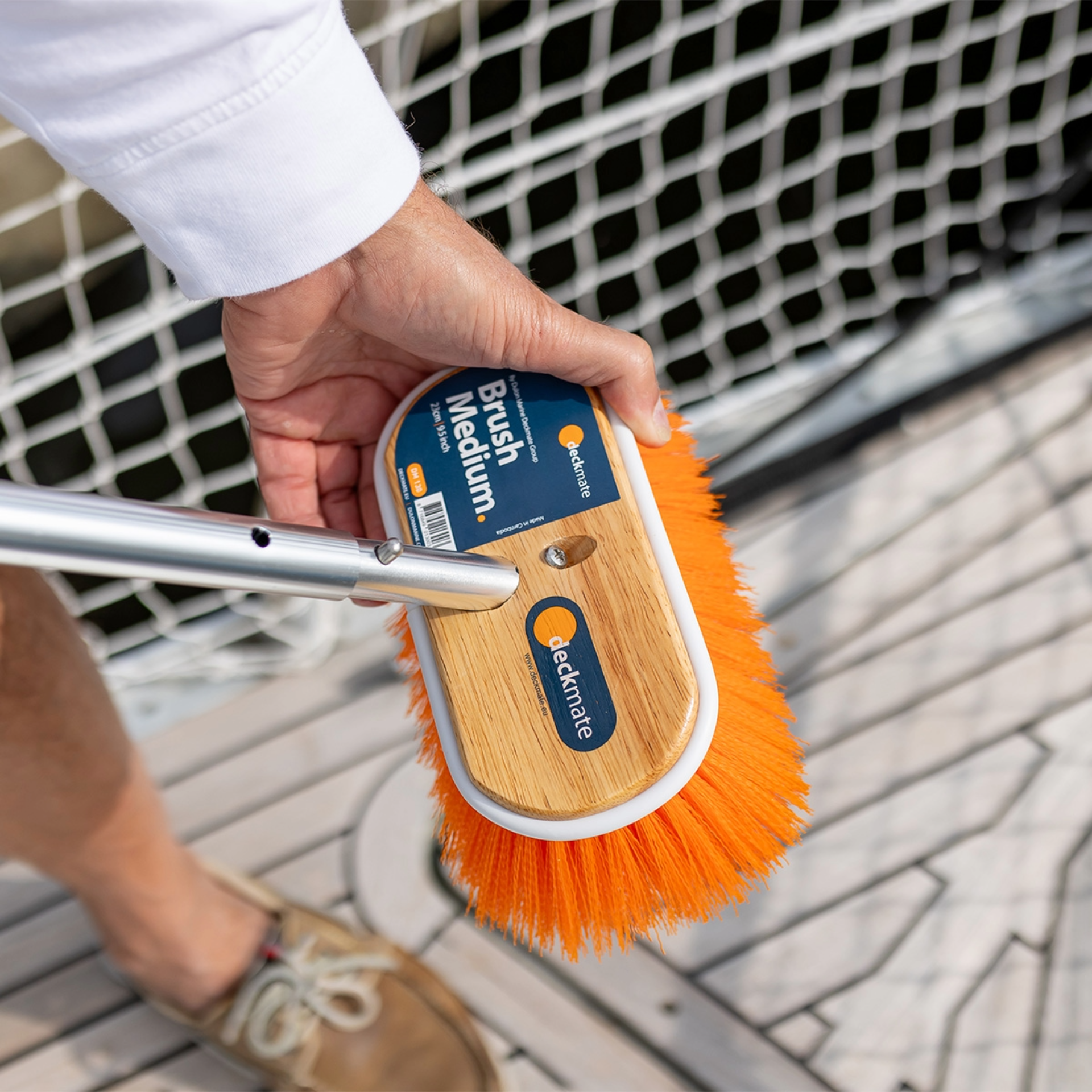 Specially designed for tougher cleaning jobs, the Deckmate Medium Brush is ideal for scrubbing teak or anti-slip decks and works equally well on canvas products. Crafted from a varnished hardwood block with angled bristles, it easily reaches into tight spaces for thorough cleaning. The 75 mm orange PVC bristles strike the perfect balance between firmness and flexibility, while a protective white bumper ensures your surfaces are cleaned without scratches or streaks.