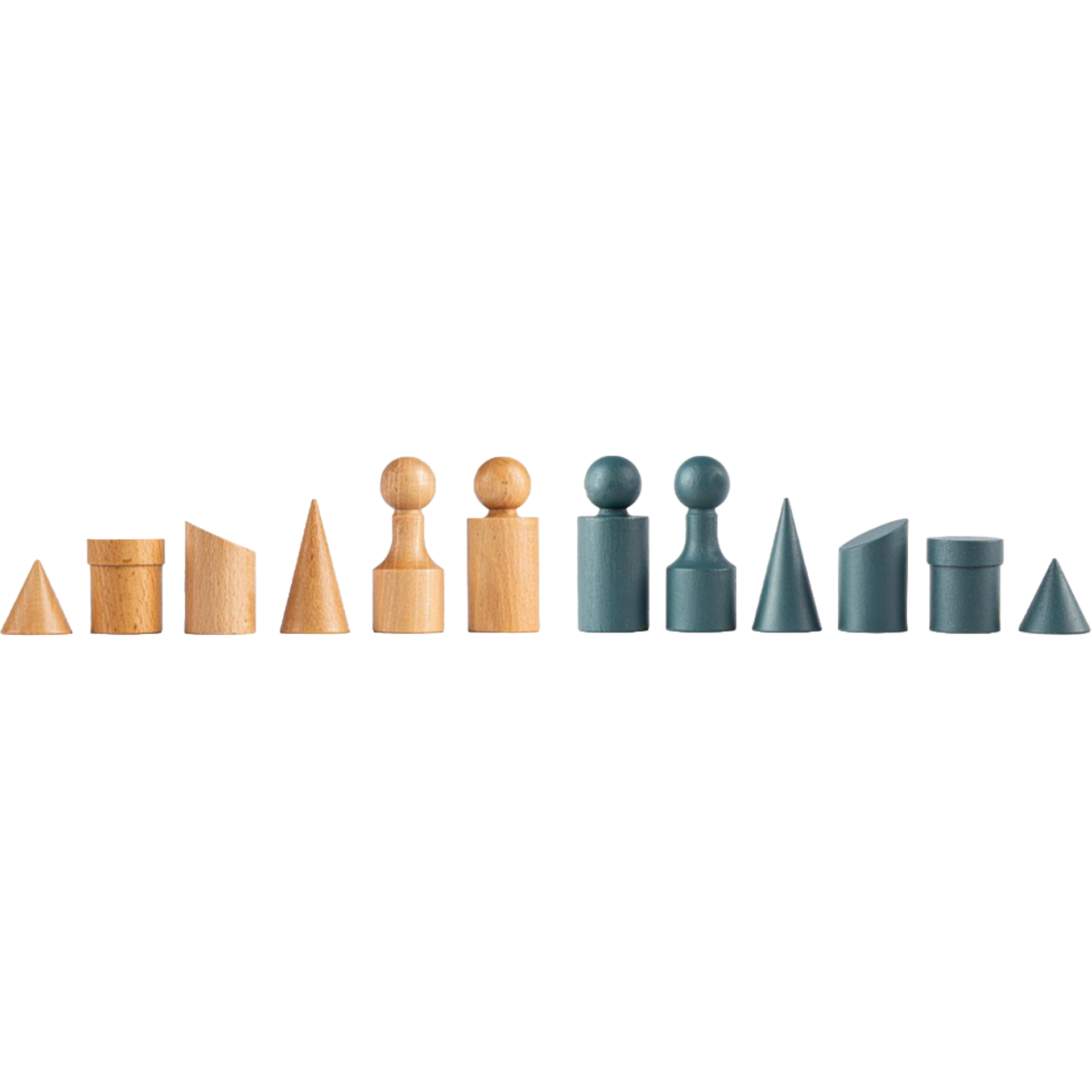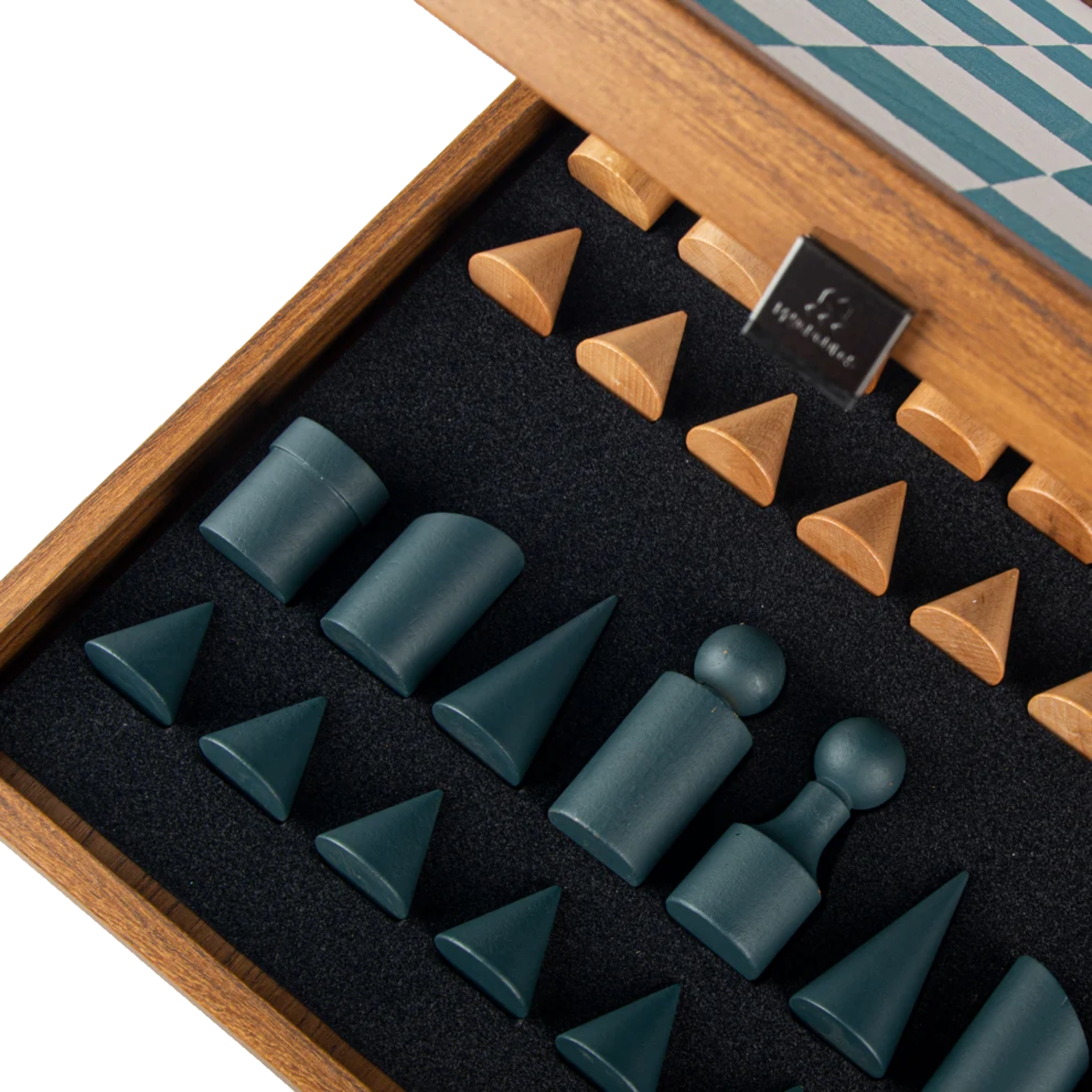 Migliorate la vostra esperienza con gli scacchi con questa moderna scacchiera intarsiata in similpelle turchese, abbinata a scacchiere in legno in stile Bauhaus nei toni del blu e del naturale. Il re di 8,5 cm e il design minimalista riflettono l'attenzione del movimento Bauhaus per le linee pulite, i cerchi e i quadrati, enfatizzando funzionalità ed eleganza.