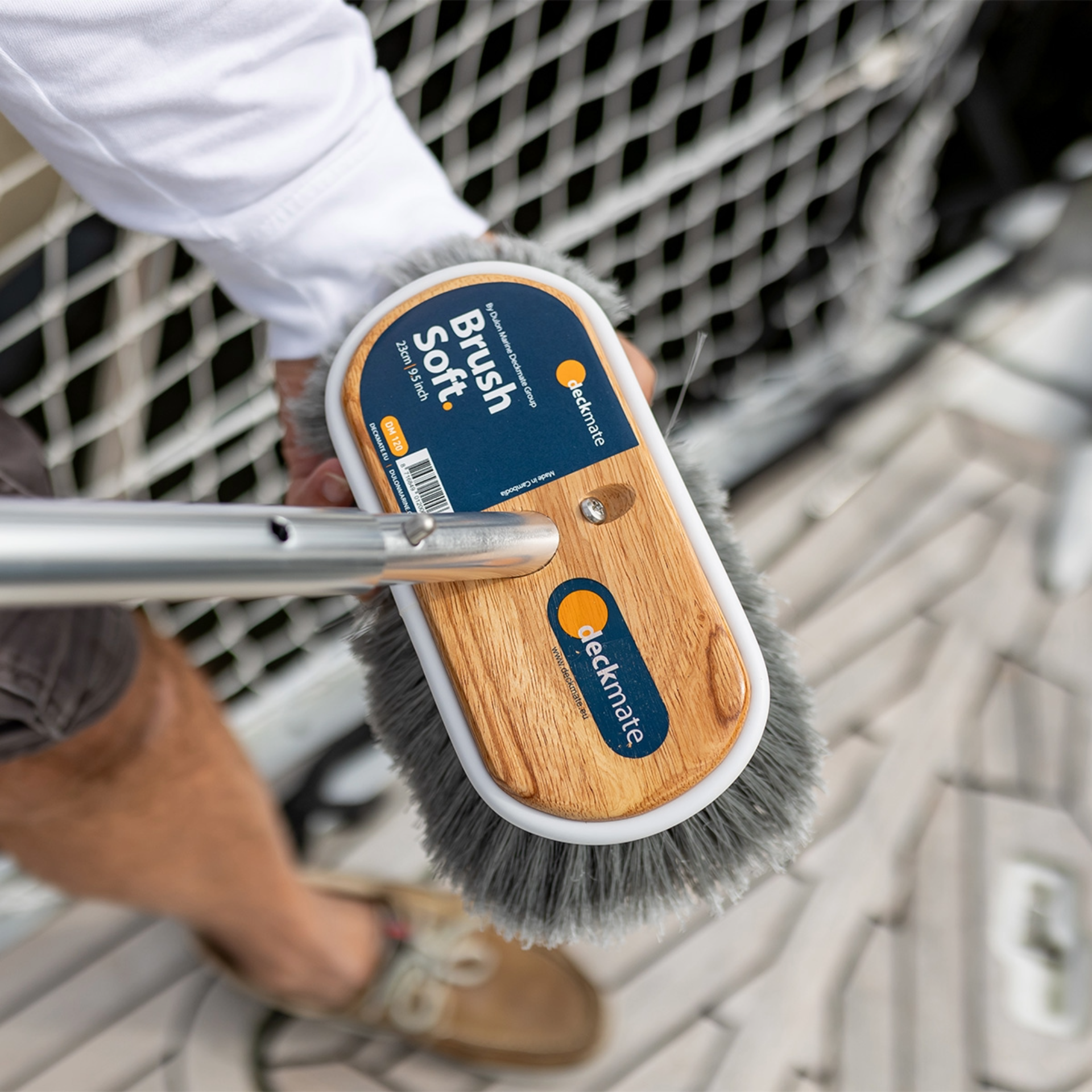 The Deckmate All-Round Brush is the most commonly used brush in the Deckmate range, designed for reliable, everyday cleaning of all boat surfaces. Made from a varnished hardwood block with angled bristles for hard-to-reach areas, it ensures effortless handling and efficiency. The 75 mm soft grey PVC bristles are split at the ends to enhance water absorption, while a protective white bumper safeguards surfaces from scratches or streaks.