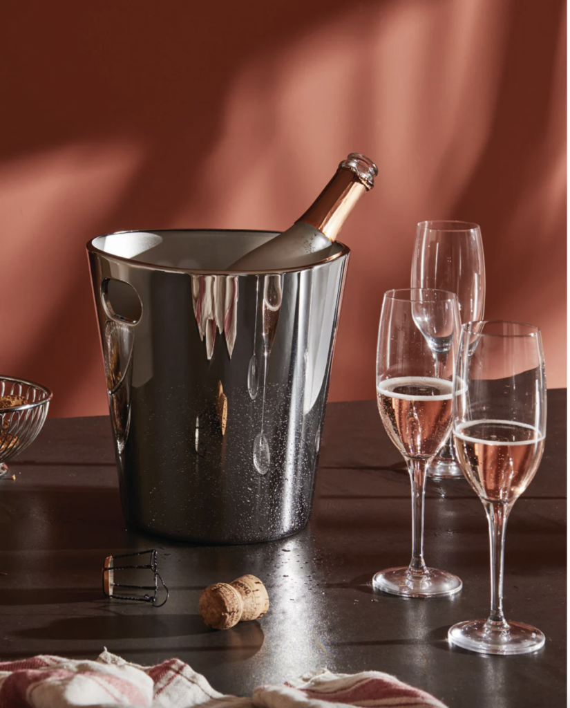 Bolly Wine Cooler – elegant stainless steel wine cooler with a polished mirror finish and iconic rounded design, perfect for chilling wine or champagne bottles while adding a refined touch to any table setting.
