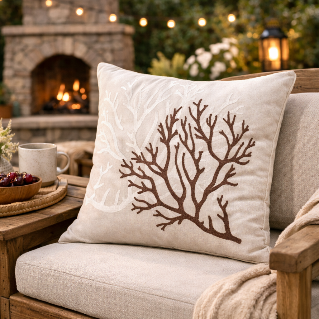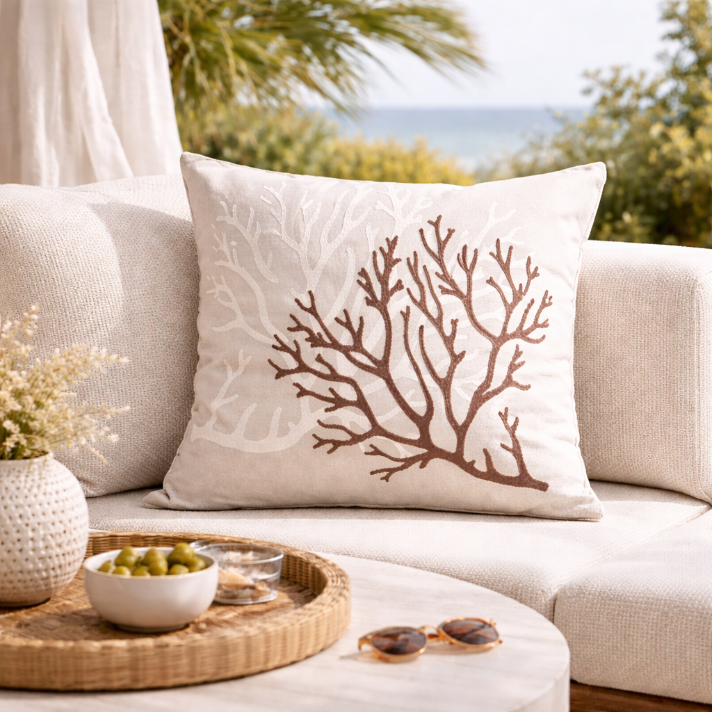 Add a refined coastal touch to your space with the Pôdevache Coralia embroidered cushion, featuring an elegant coral motif with textured embroidery for a sophisticated, tactile finish. Its neutral tones and organic design bring a calm, Mediterranean feel that works beautifully in both modern and relaxed settings.