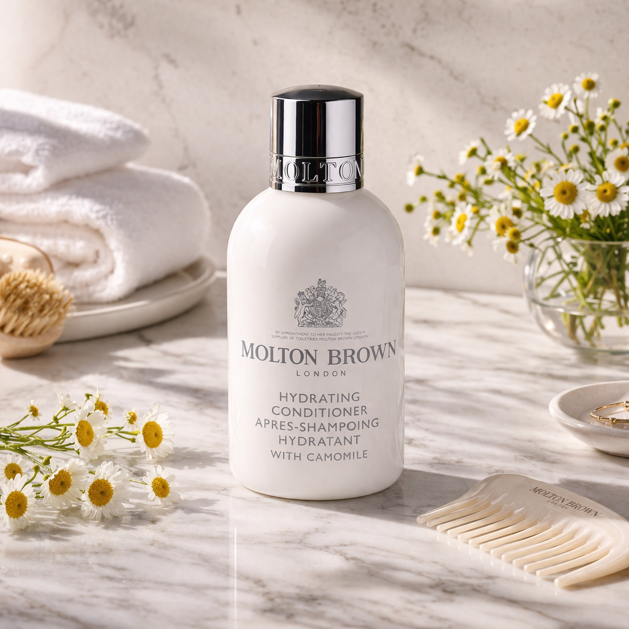 Restore softness and shine with Molton Brown Hydrating Conditioner with Camomile, a luxurious formula designed to deeply moisturise and detangle hair. Enriched with sustainably sourced camomile—grown hydroponically in London—it helps soothe the scalp while replenishing moisture levels for a silky-smooth finish. Gentle, hydrating, and beautifully fragranced, it transforms everyday haircare into a calming, spa-like ritual.