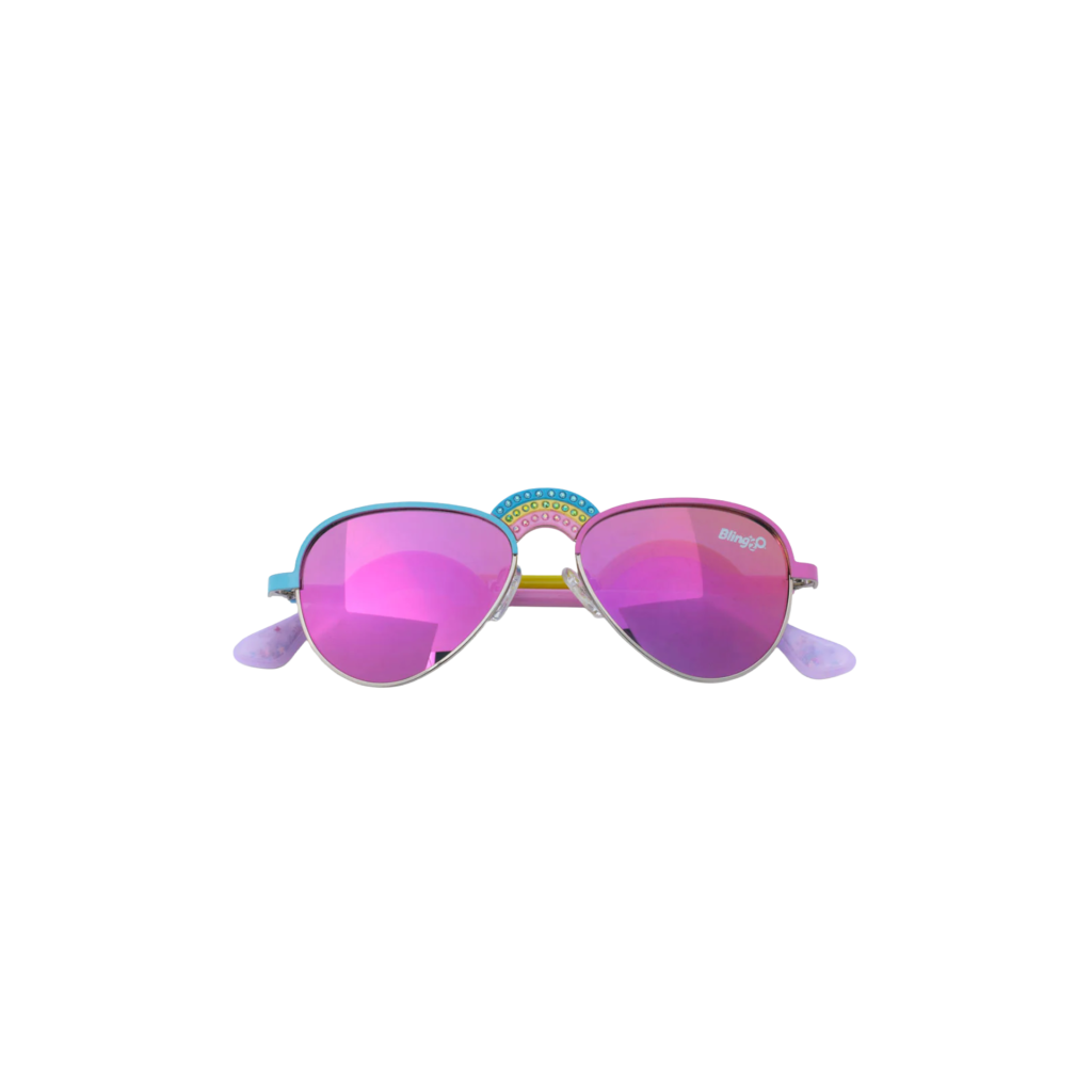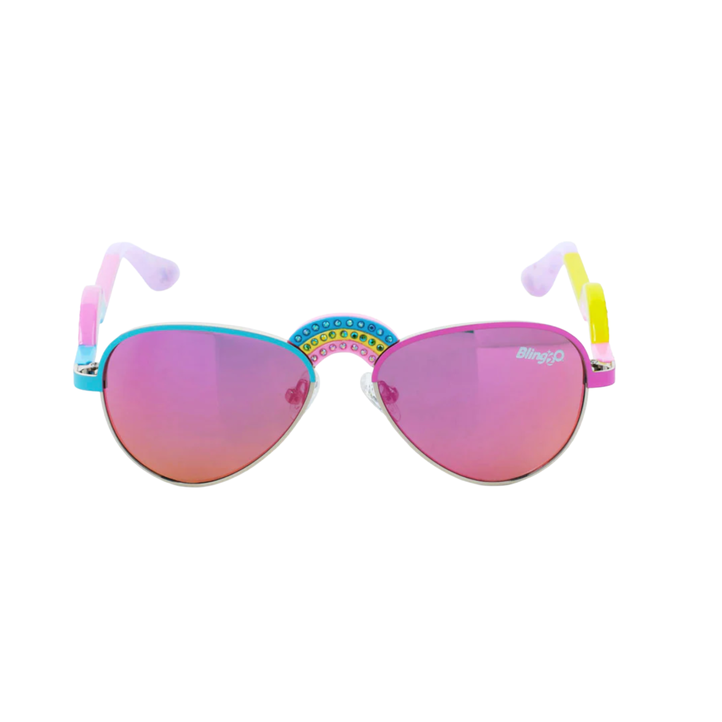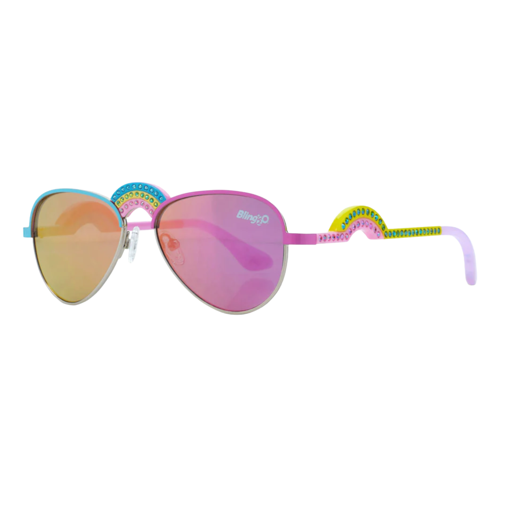 Bring colourful style and UV protection to every sunny swim or beach day with the Bling2o Rising Rainbow Ibiza Beach kids’ sunglasses, designed for comfort, fun, and everyday wear in the sun. These vibrant aviator‑style shades feature dazzling rainbow rhinestone detailing across the bridge and temples, making them both stylish and playful for kids aged 6+.