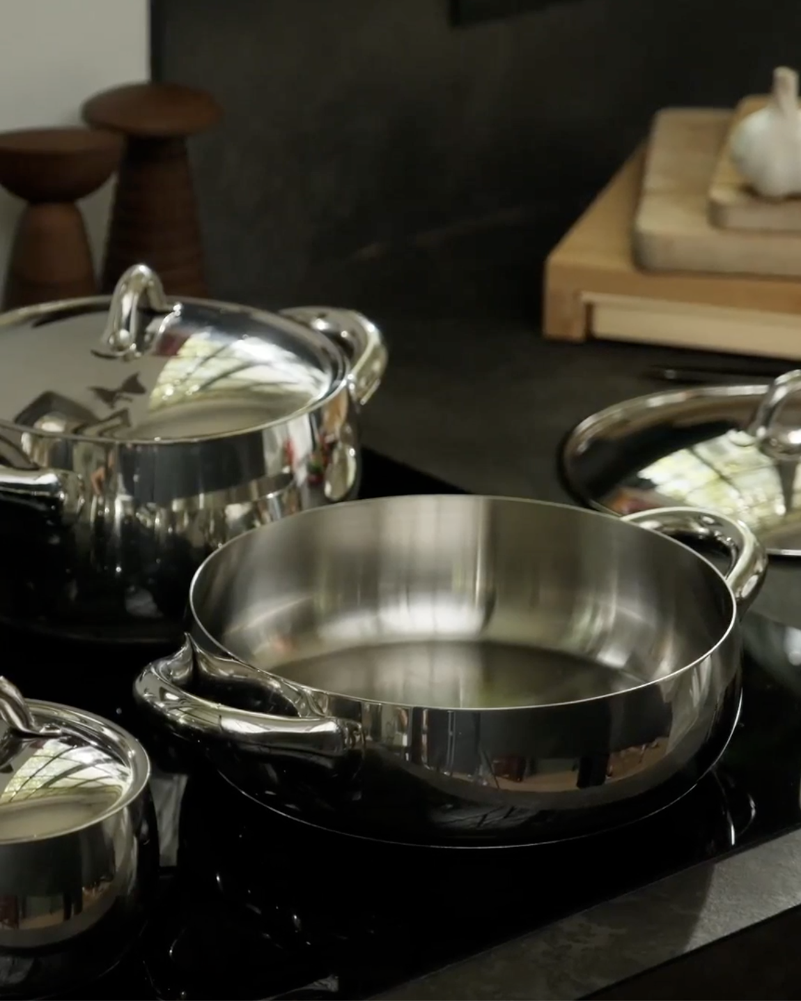 Mami Pots and Pans Set of 7 Pieces – high-quality 18/10 stainless steel cookware set with ergonomic handles and matching lids, versatile for simmering, boiling, frying, and everyday family cooking.