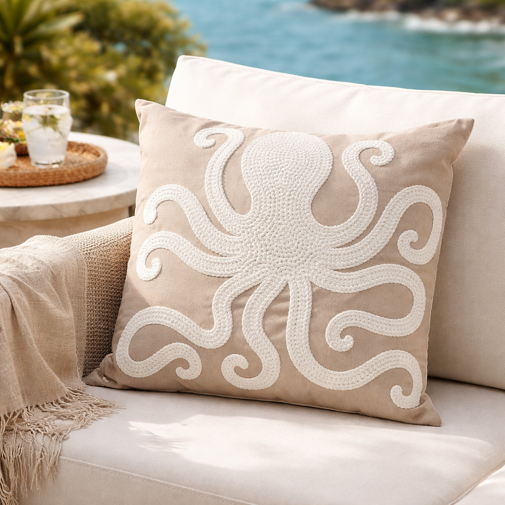 Add a refined coastal touch to your space with the Pôdevache Coralia embroidered cushion, featuring an elegant coral motif brought to life through rich, textured embroidery. Its soft neutral tones and organic design evoke a calm Mediterranean atmosphere, effortlessly complementing both contemporary and relaxed interiors.