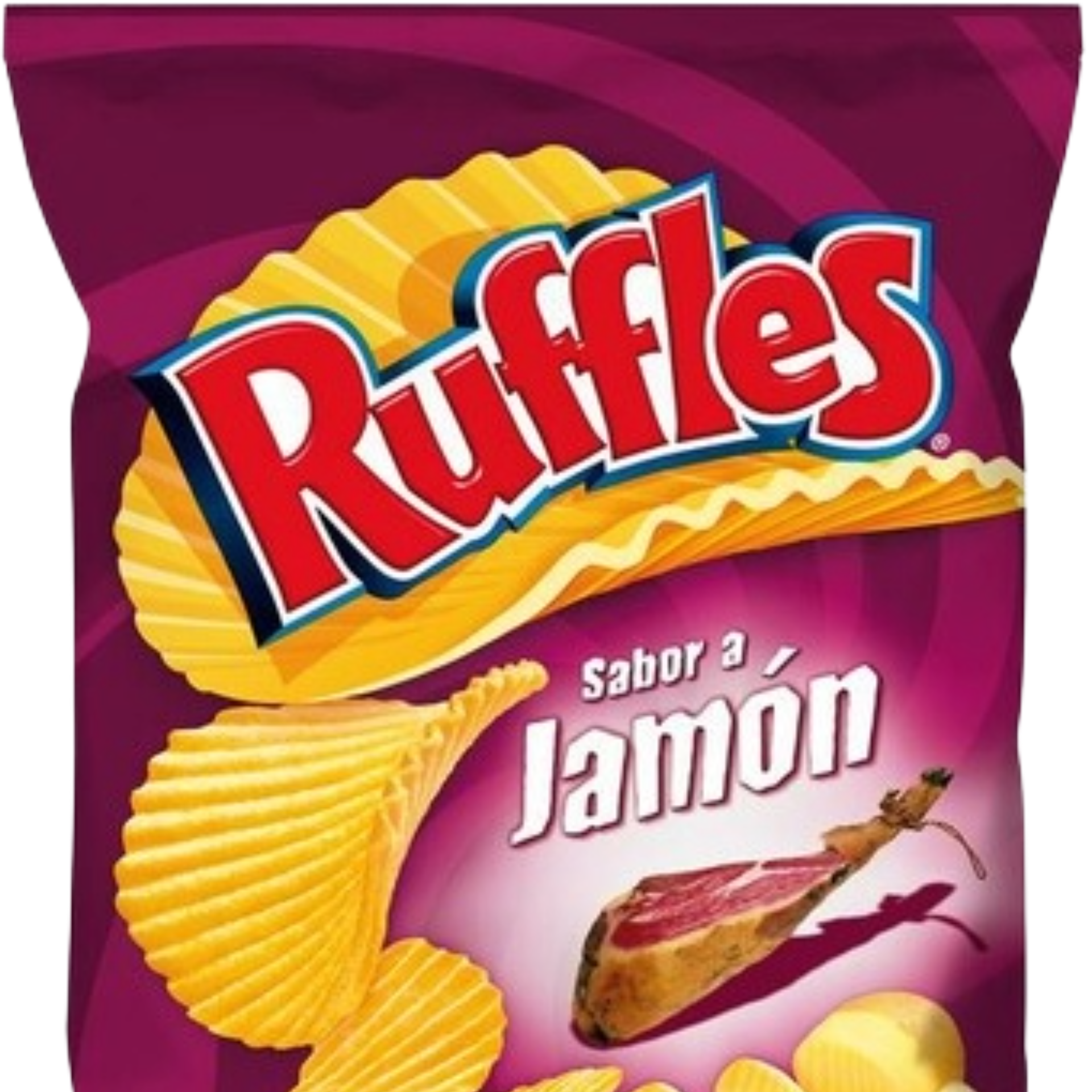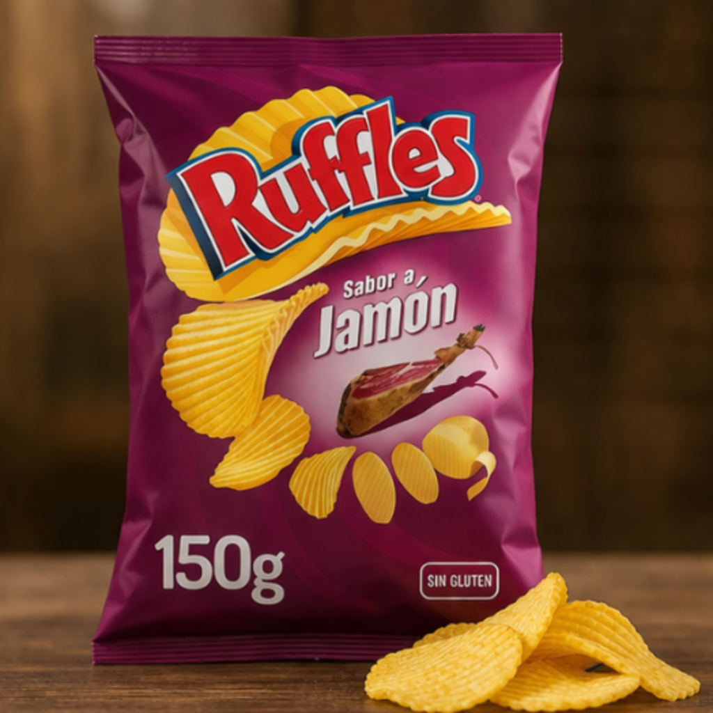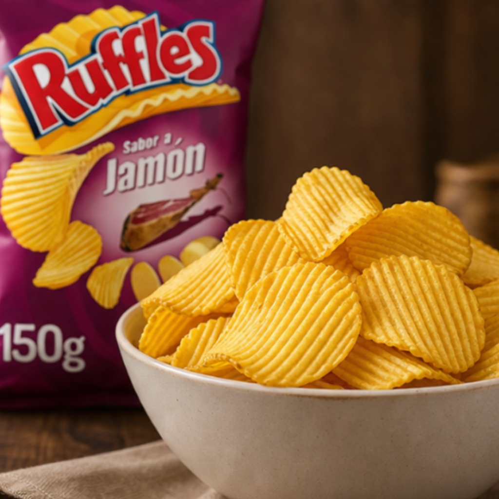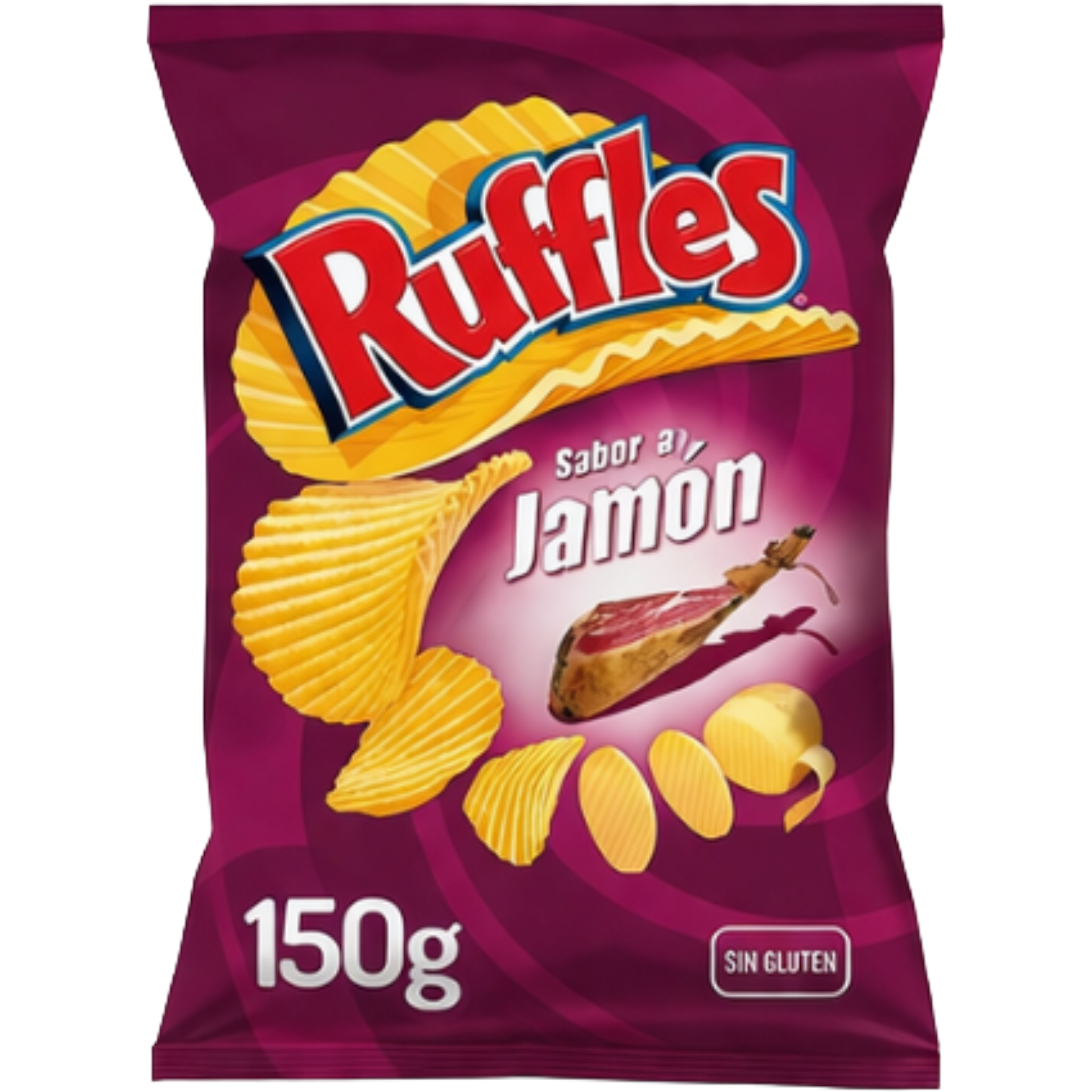 Crunchy Ruffles Jamón chips packed with rich, savory, and smoky ham flavor in every bite. Perfect for snacking anytime, anywhere.