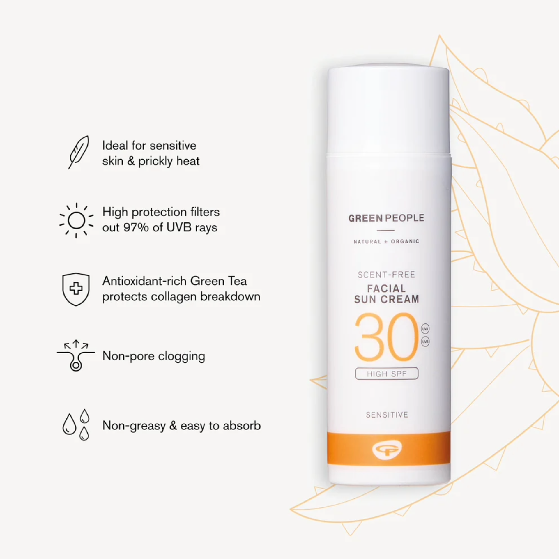 Protect your skin every day with Green People Scent Free Facial Sun Cream SPF30, a gentle yet effective moisturiser with built-in sun protection. Designed especially for sensitive skin, it combines hydrating Aloe Vera and antioxidant-rich plant extracts to soothe while shielding against UV damage. Its fragrance-free, non-greasy formula makes it perfect for comfortable daily wear.