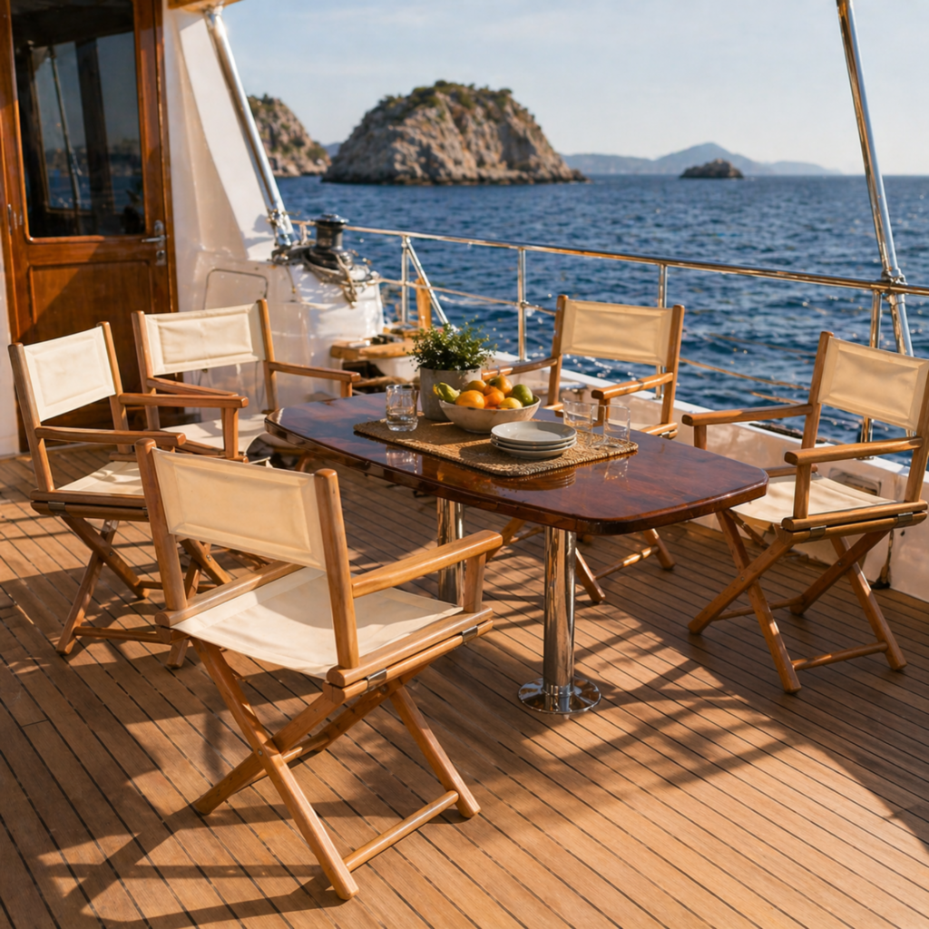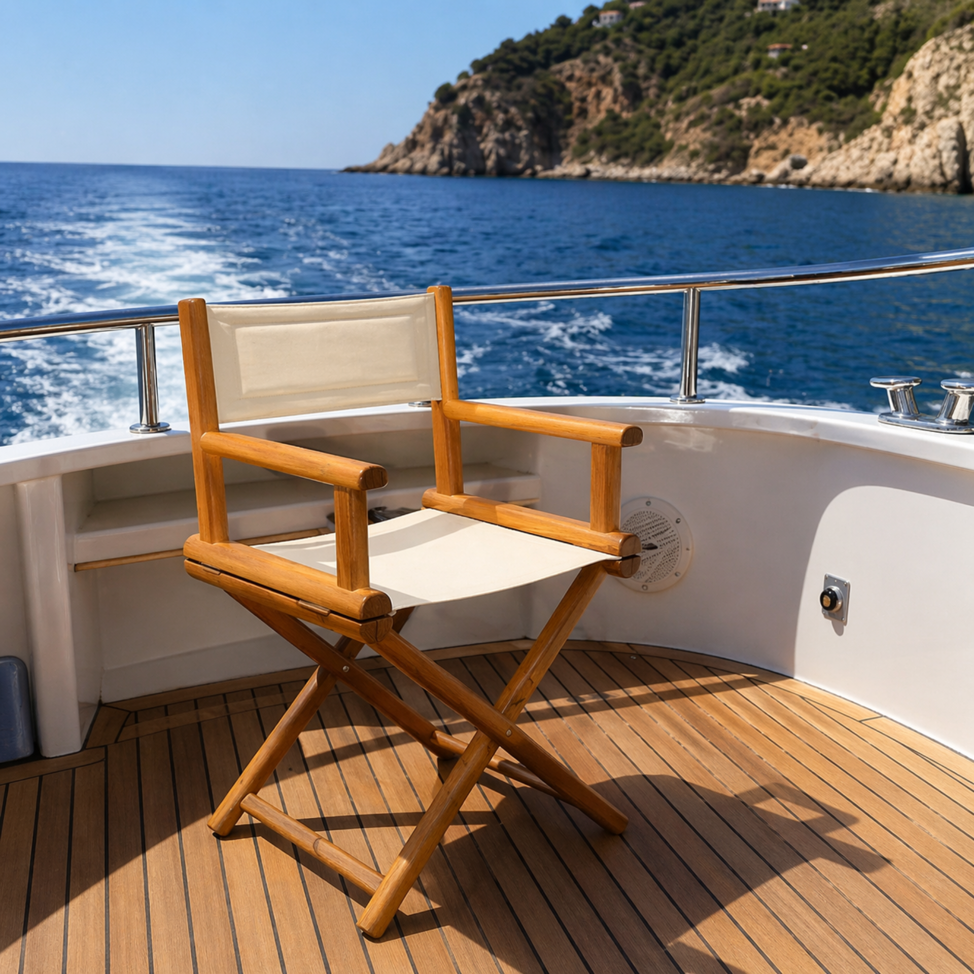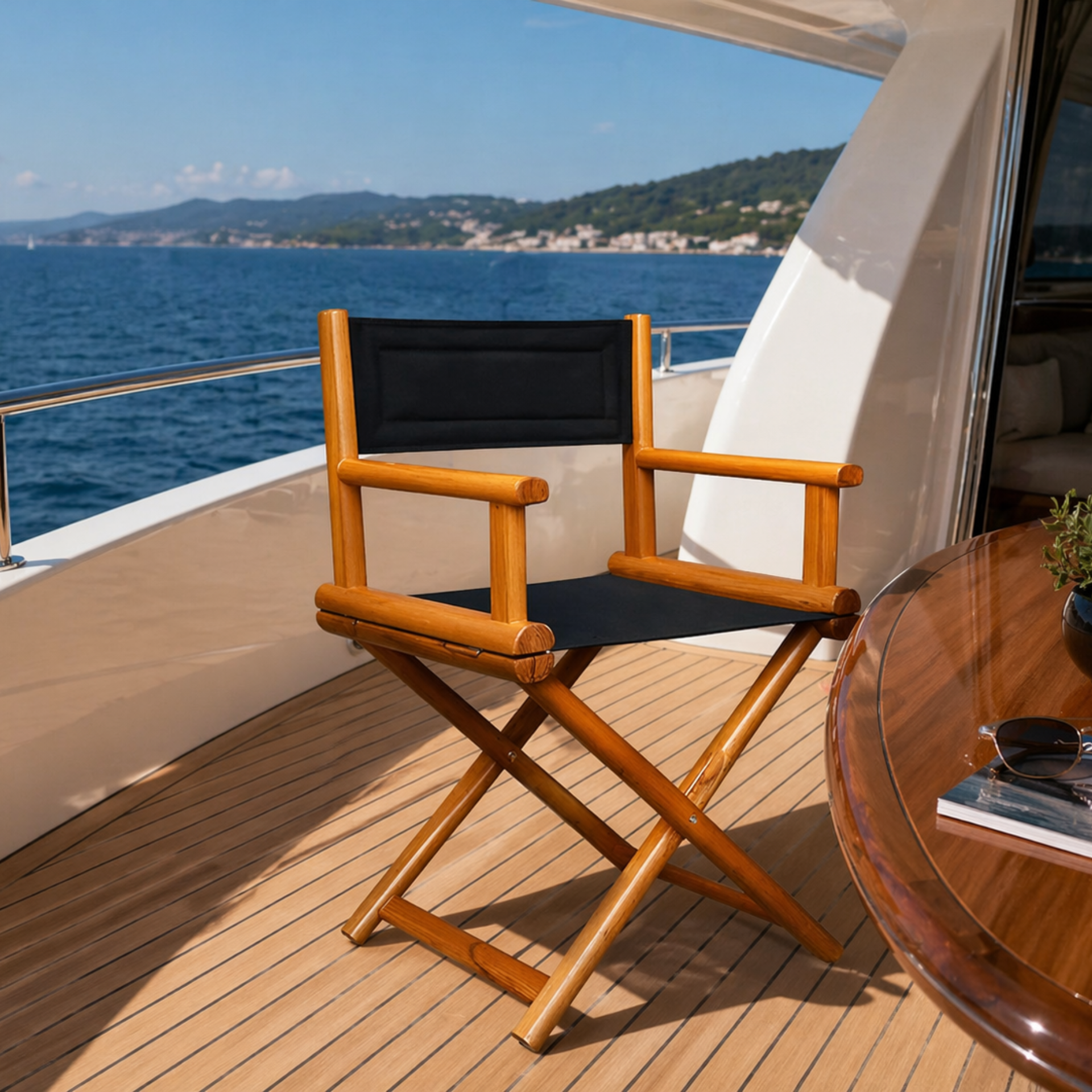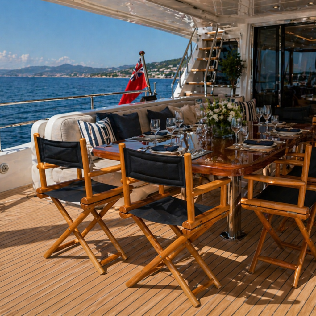 - Folding director’s chair designed for yacht deck use